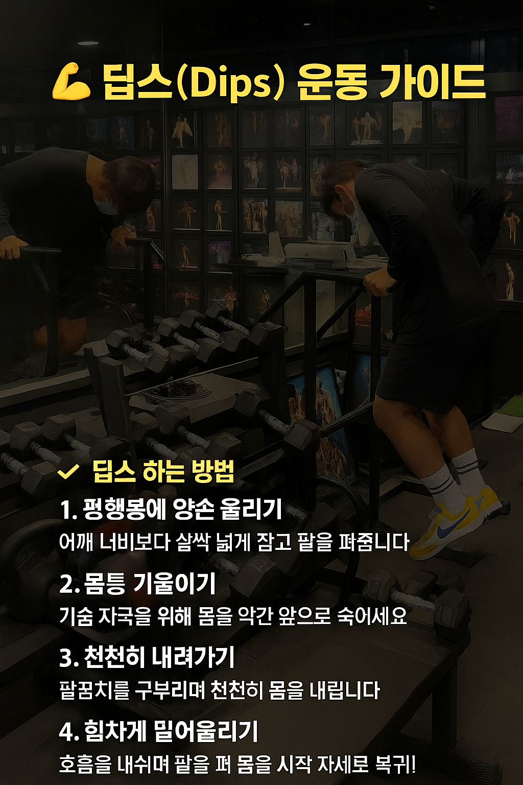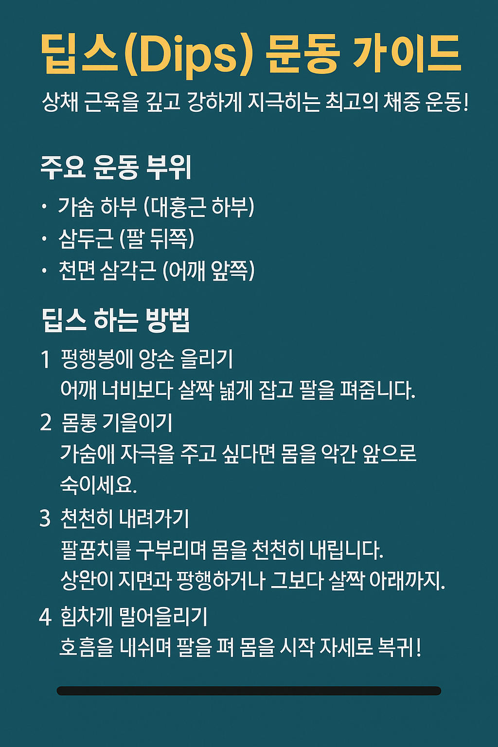 딥스는 자신의 체중만으로도 강한 상체를 만드는 핵심 운동입니다. 꾸준히 하면 넓은 가슴과 단단한 팔, 균형 잡힌 어깨를 가질 수 있어요. 처음엔 어렵지만 점점 익숙해지면 최고의 무기가 됩니다!